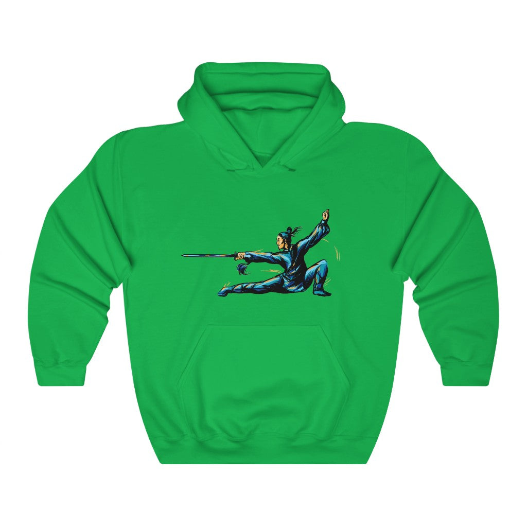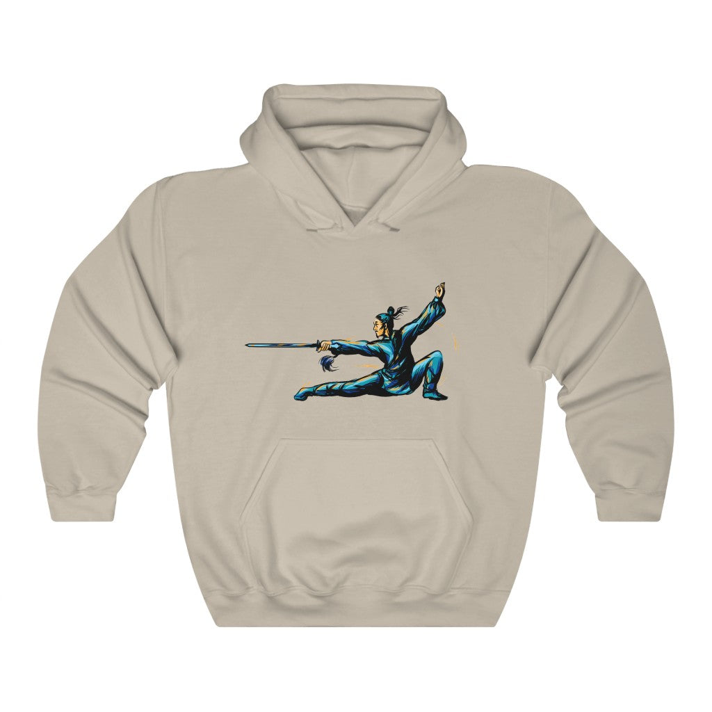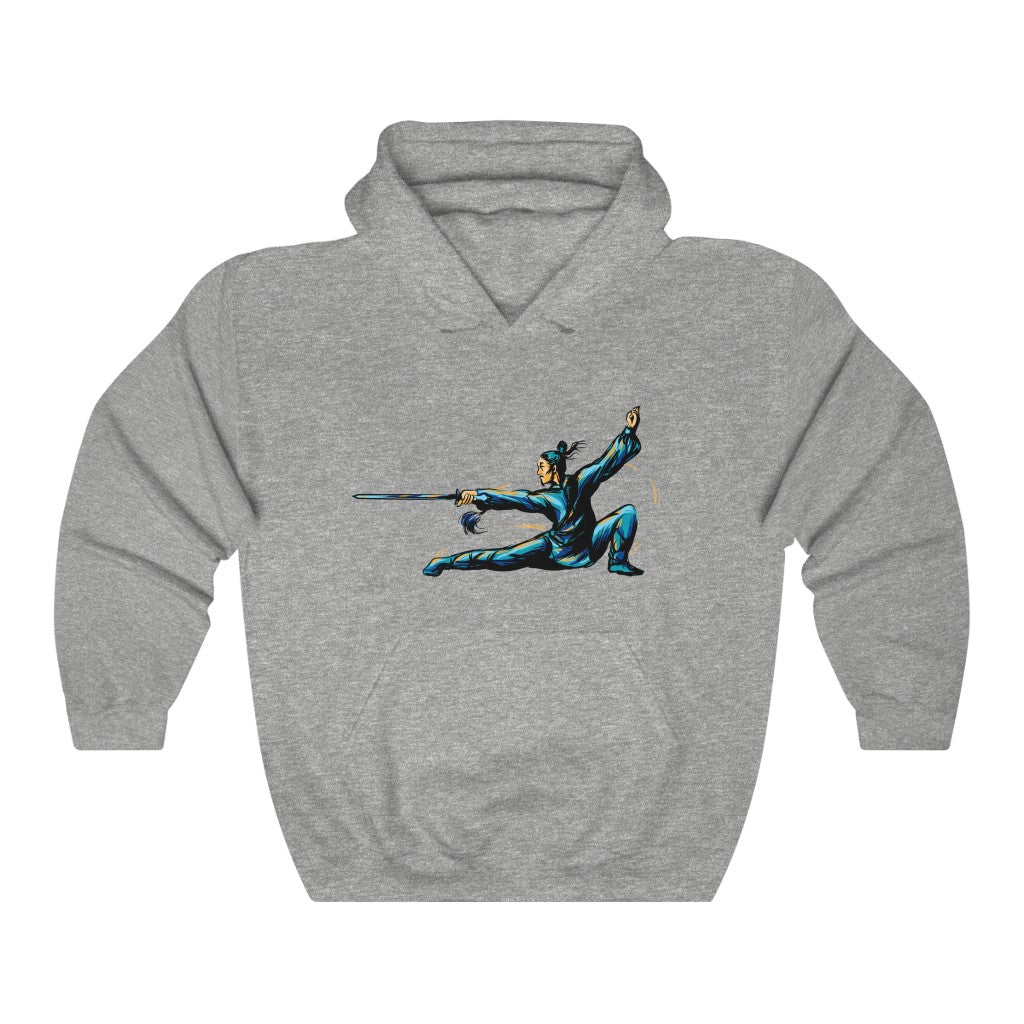 Unisex Heavy Blend™ Hooded Sweatshirt "Master of wushu in a blue kimono with a sword on training"